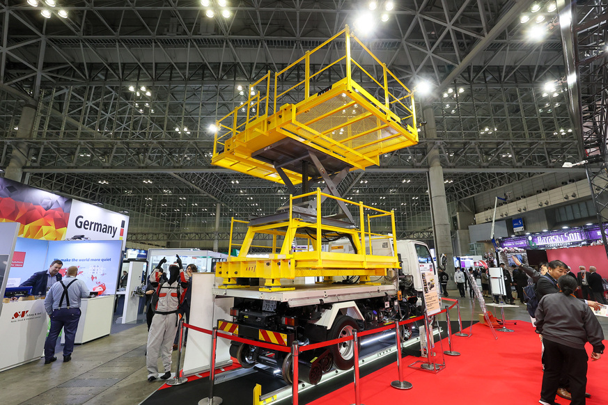 アクティオは、新型の軌陸ダンプや車載式高所作業台、衝突軽減システムなどを出展。現場環境の改善や業務効率の向上、災害対応力の強化などに寄与する最先端の商品を紹介しました。