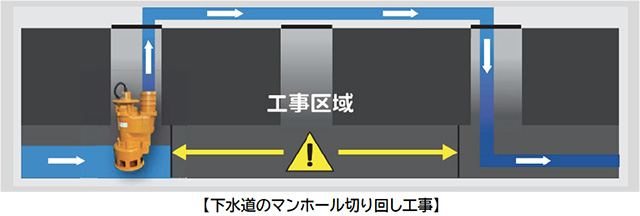 現在、国内インフラの老朽化にともない、下水道の更新工事や改修工事は年々増加しています。こうした工事では、施工区間に下水が流れ込まないようにする必要があり、下水を迂回させる「切り回し」作業が必要になります。汚水用の水中ポンプは機械の構造上、一般的な下水道のマンホール(開口部内径600mmの1号マンホール)に入らないものが多く、これまでは通過粒径が小さい汎用的な水中ポンプで代用していましたが、異物の多い下水では異物混入による詰まりがトラブルの大きな原因となっていました。