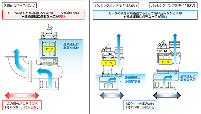 ②水位が低くても排水の流れでモータを冷却する独自の「片水路構造」により連続運転が可能