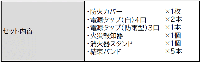 ①防火カバー、電源タップ、火災報知器、消火器スタンド、結束バンドがセットになった充実の内容
