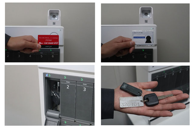 ⑦鍵管理機に会員カードまたはQRコードおよび免許証をタッチ、指定キーを取り出し、車両をレンタル