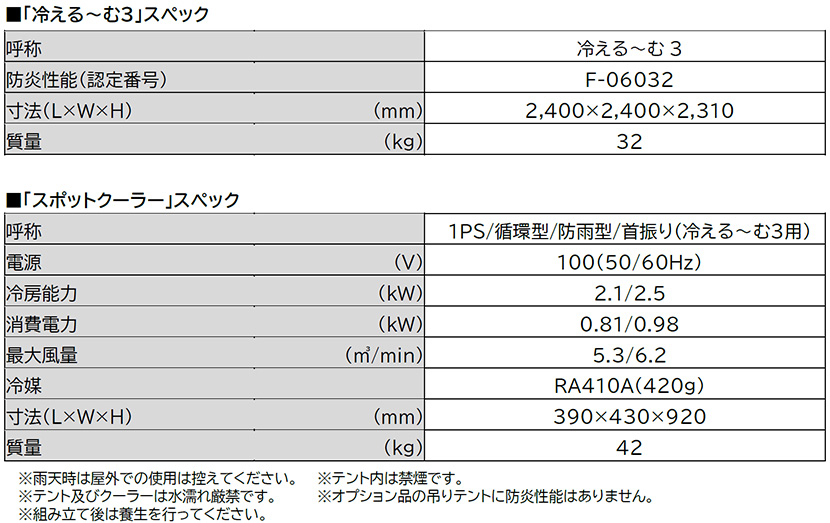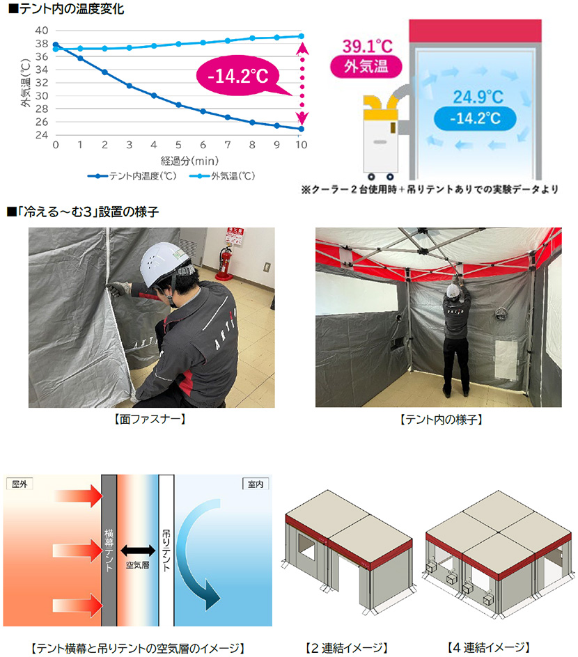 こうした課題を解決するために開発されたのが「冷える~む3」です。1テントにつきスポットクーラー2台を配置し、スポットクーラーから出る冷気で室内を冷やし、その冷気をスポットクーラーが吸い込んでさらに冷やす循環式を採用しました。さらに、テントの横幕とオプションの吊りテントを併用し、テント間に「空気層」を生み出すことで、優れた断熱効果を発揮します。これらにより、外気温と比較して最大14℃冷却することを実現しました。また、2人の作業員で約6分という短時間で組み立てができ、工程により日々変わる作業場所に合わせて移設が可能です。テント面は面ファスナー(布製の留め具)を採用し、2台連結や4台連結など、テント同士の連結が自在に行えます。さらに、屋根をフラット設計にしたことで、天井の高さに制約のある建築現場での設置も可能にしました。